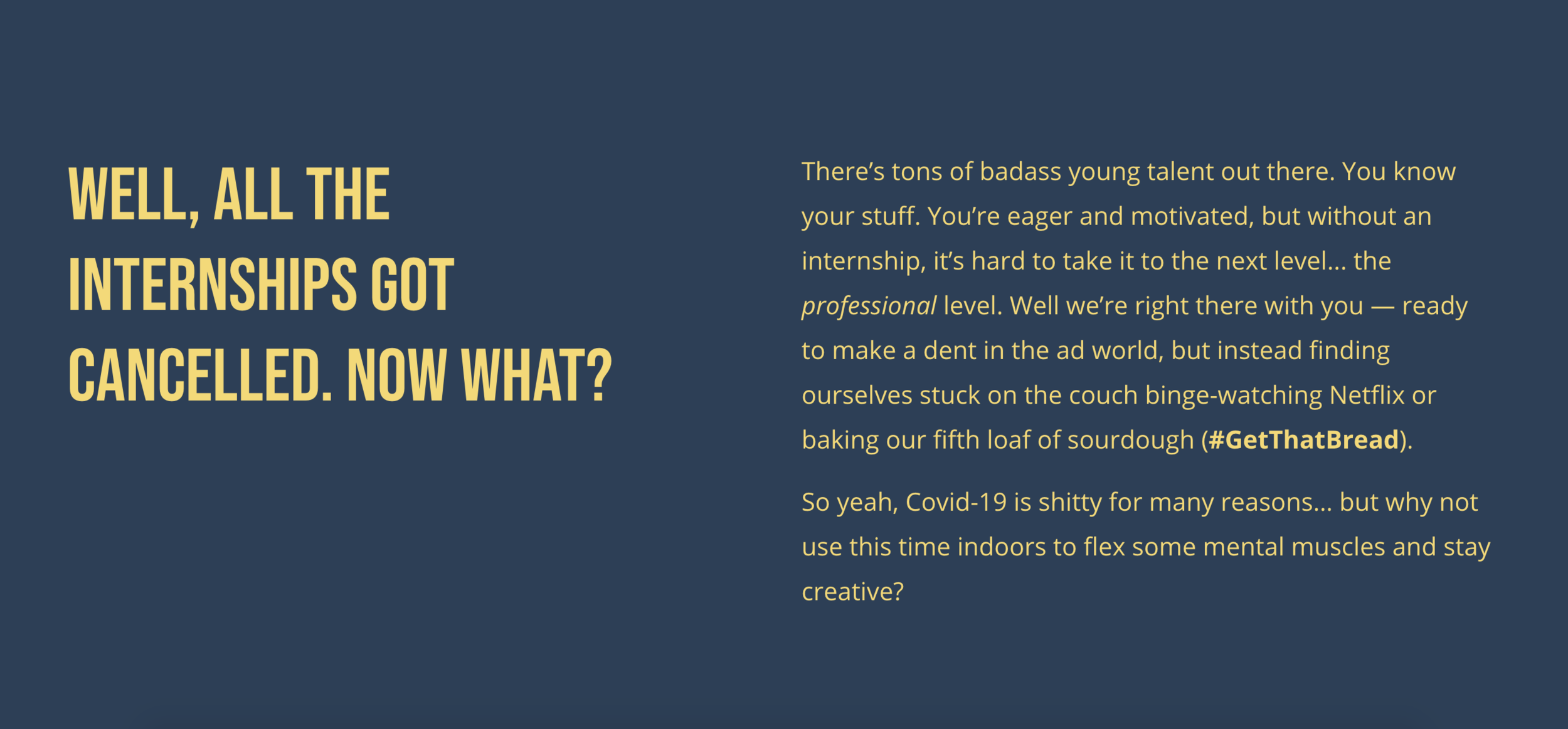 Task: Create, brand and launch a virtual advertising pitch competition for students and recent graduates missing out on invaluable professional experience due to Covid-19 (this task was very much self-imposed…).